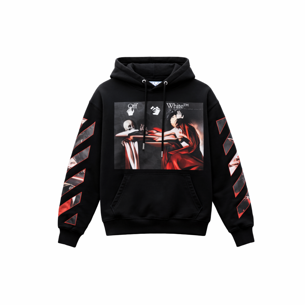 Black hoodie with a classic art-inspired front print, signature diagonal stripes on the sleeves, and a premium streetwear look.