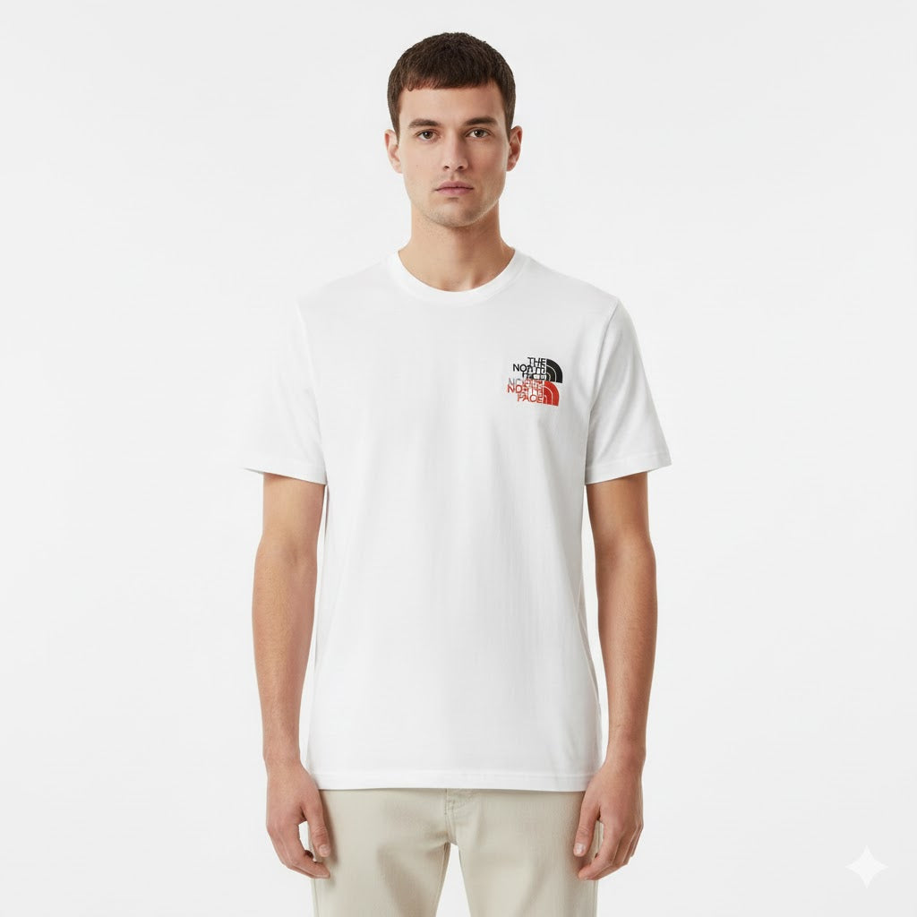 A white The North Face short-sleeve T-shirt featuring a stacked logo graphic on the chest in multiple colors. Made from soft, comfortable fabric with a classic crew neck and relaxed fit, it’s perfect for everyday casual wear and outdoor-inspired style.